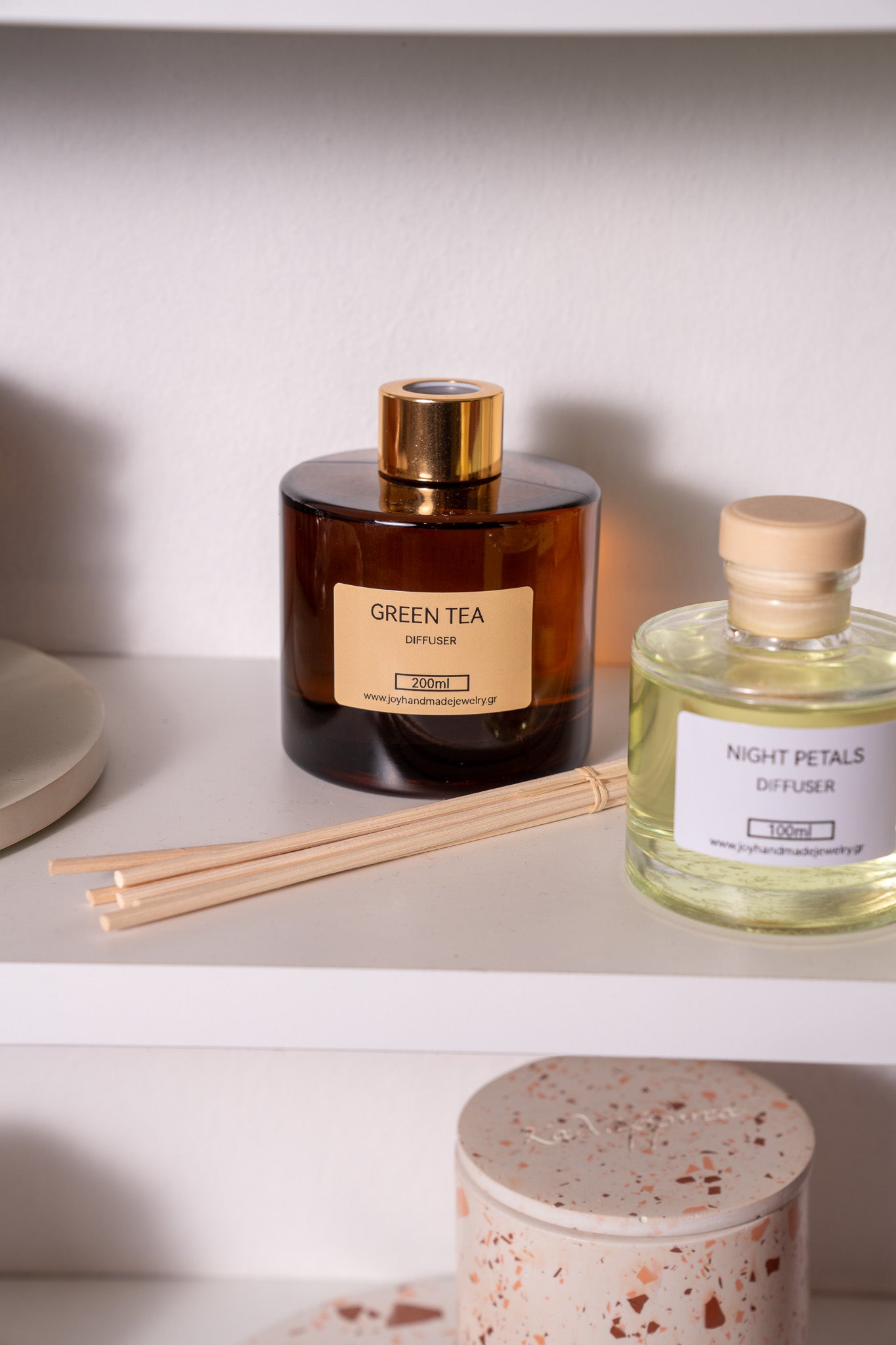 Ο χειροποίητος diffuser σε γυάλινο καφέ δοχείο 200 ml συνδυάζει διαχρονική αισθητική με φυσική ζεστασιά. Τα επιλεγμένα αρωματικά έλαια απελευθερώνονται σταθερά, γεμίζοντας τον χώρο με ατμόσφαιρα χαλάρωσης και κομψότητας.